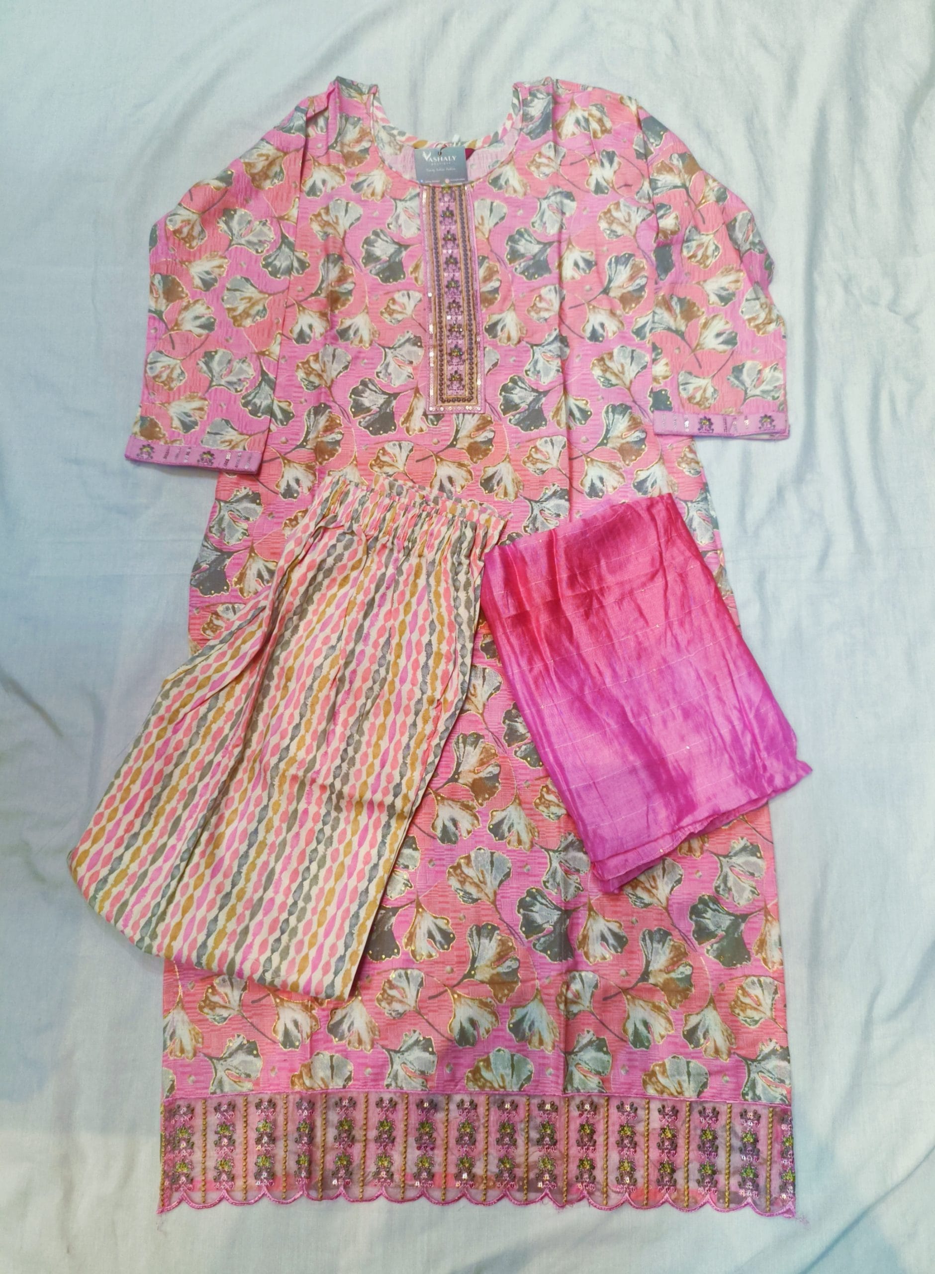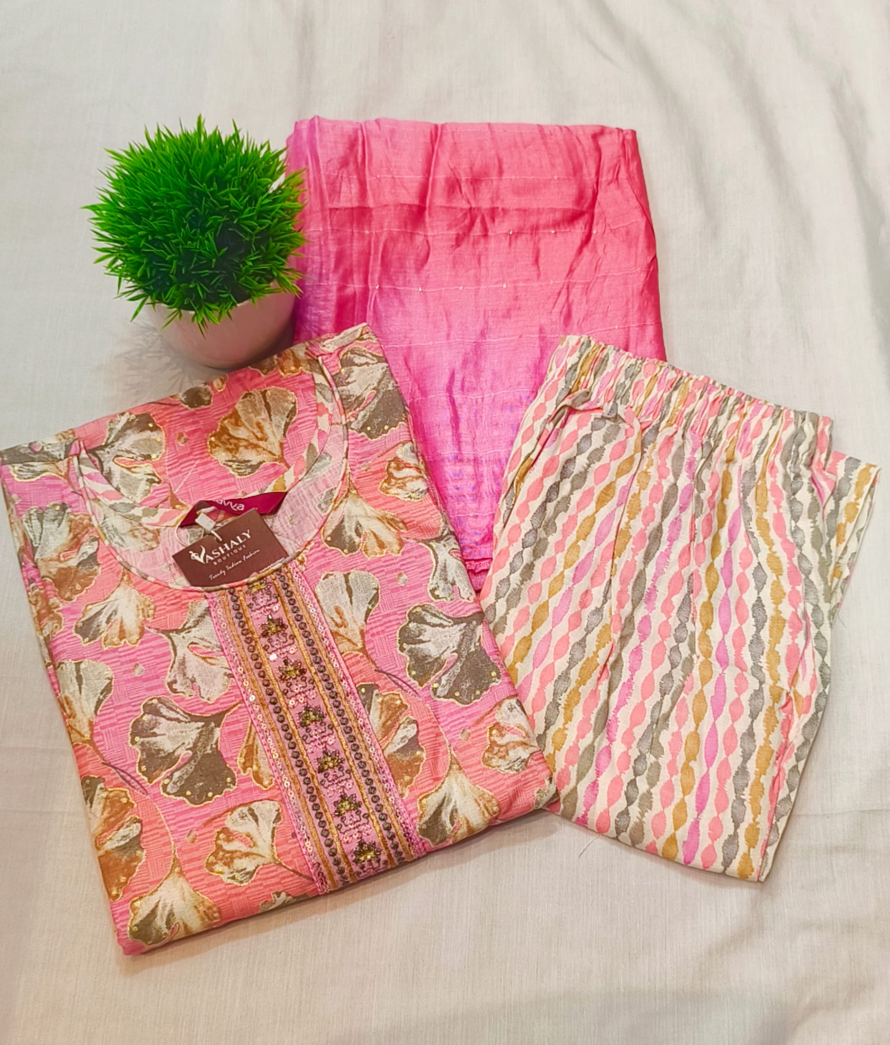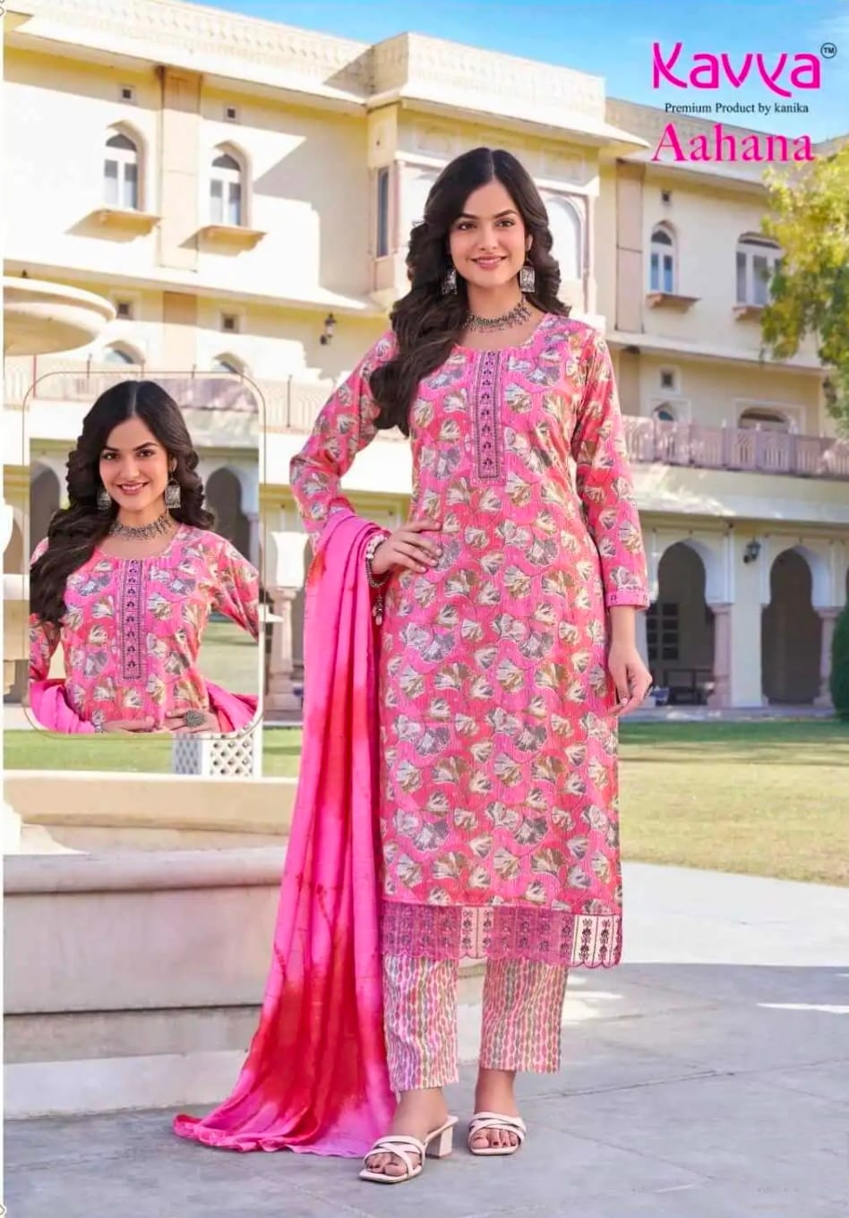 Presenting our latest midsummer festive collection 3-piece suits – the chic and trendy Aahan Suits. These festive look 3-piece sets comes in Rayon-Cotton material with beautiful floral prints & lace works around the chest, sleeves and bottom. The contrasting pants comes with pockets and drawstring. Dupatta comes in soft cotton Silk in ombre design with sequence works.