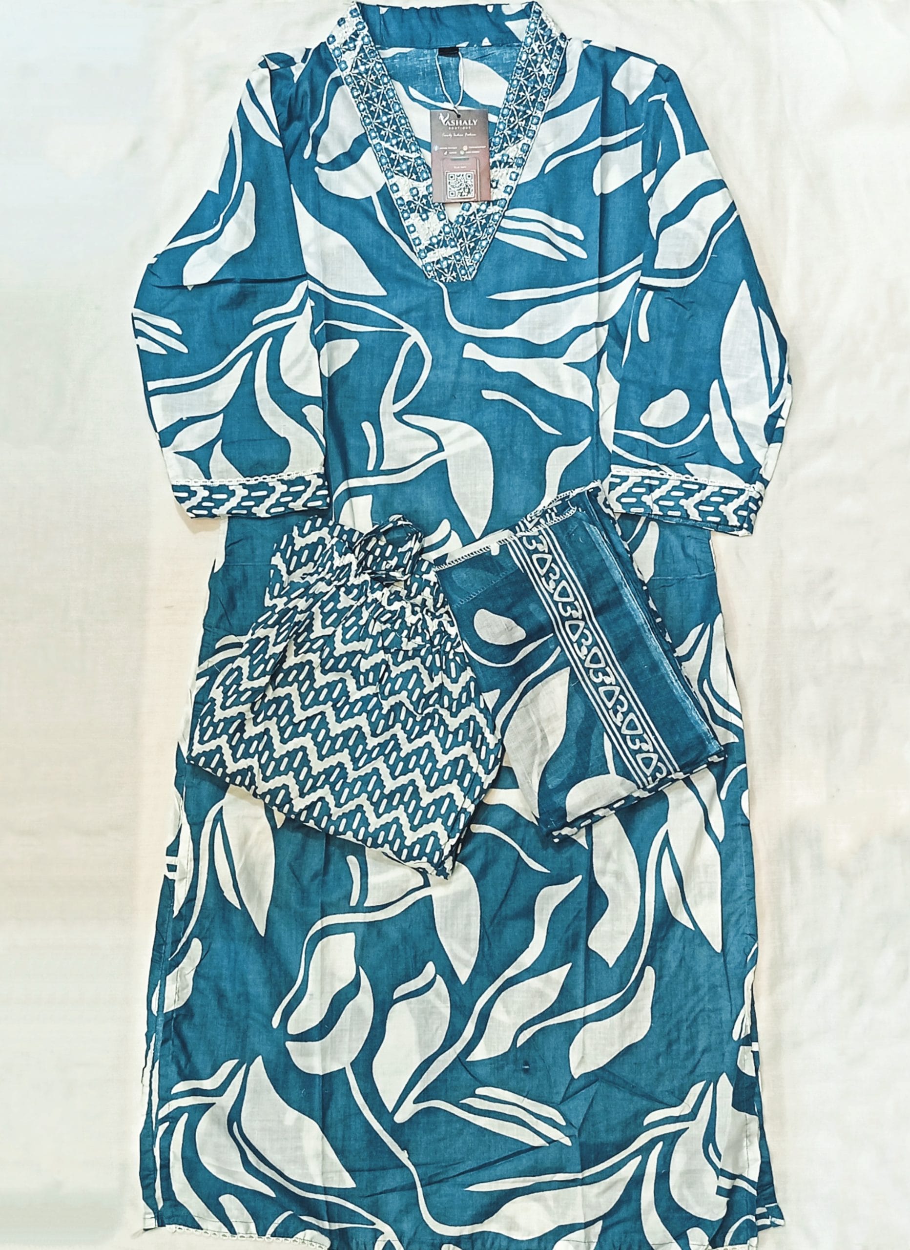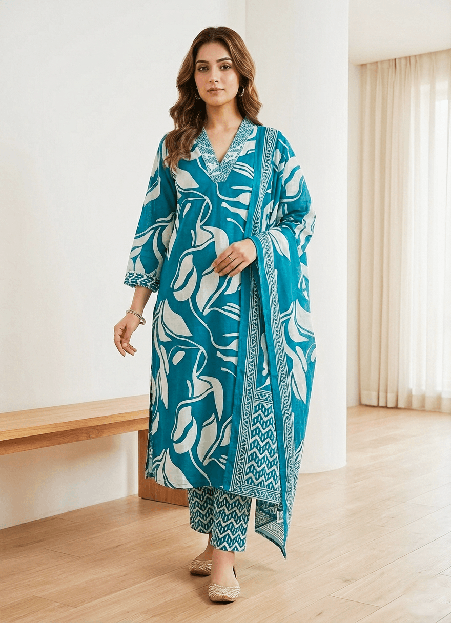 A chic and trendy 3-piece Cotton Kurti that emphasizes both comfort and style. Comes in Mul Cotton with the Tops in Embroidered V-Neck, laced sleeves end and hemline. Pants with pocket & drawstring.