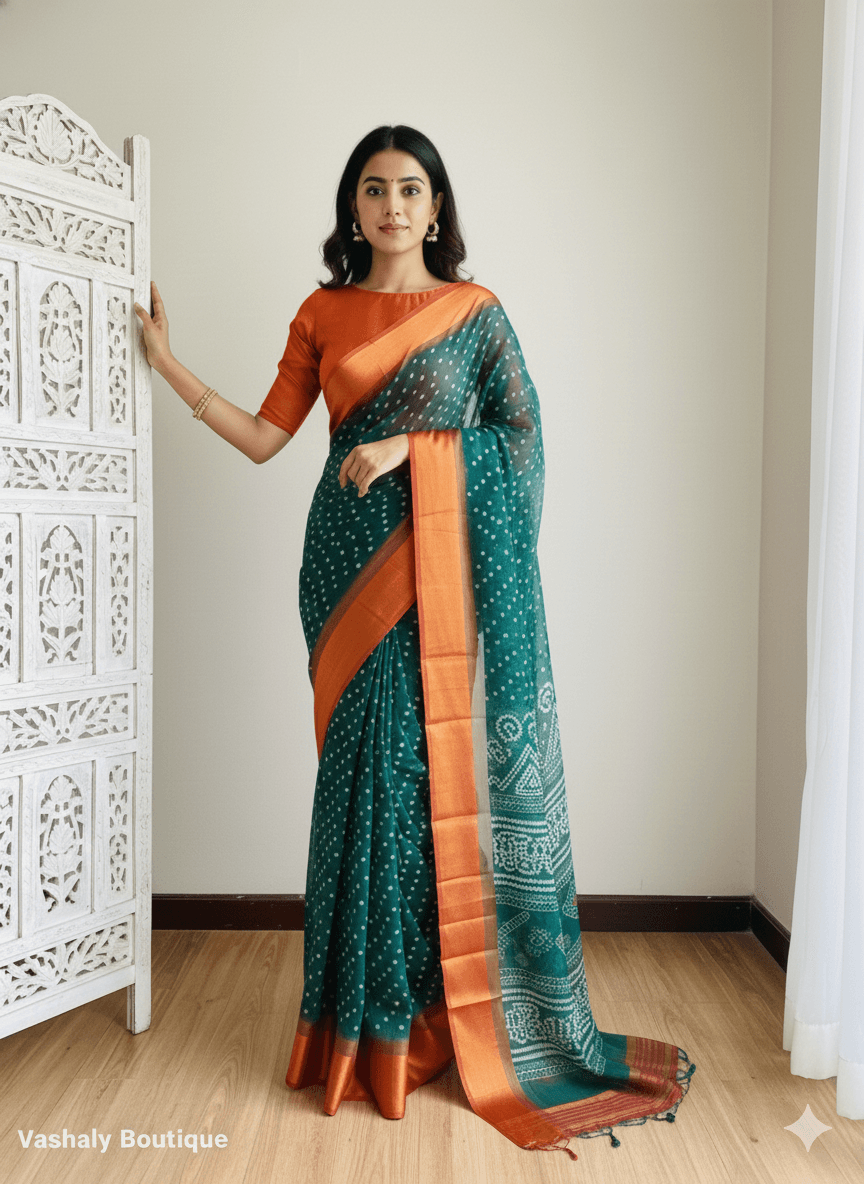 An exclusive festive collection Bandani-Viscose Chiffon Saree. The saree is very, very soft and light as a feather and can be easily draped. The border comes in golden silver Zari with Viscose design. Saree body is in bandani prints and vibrant colors. Pallu and blouse comes in contrast colours.