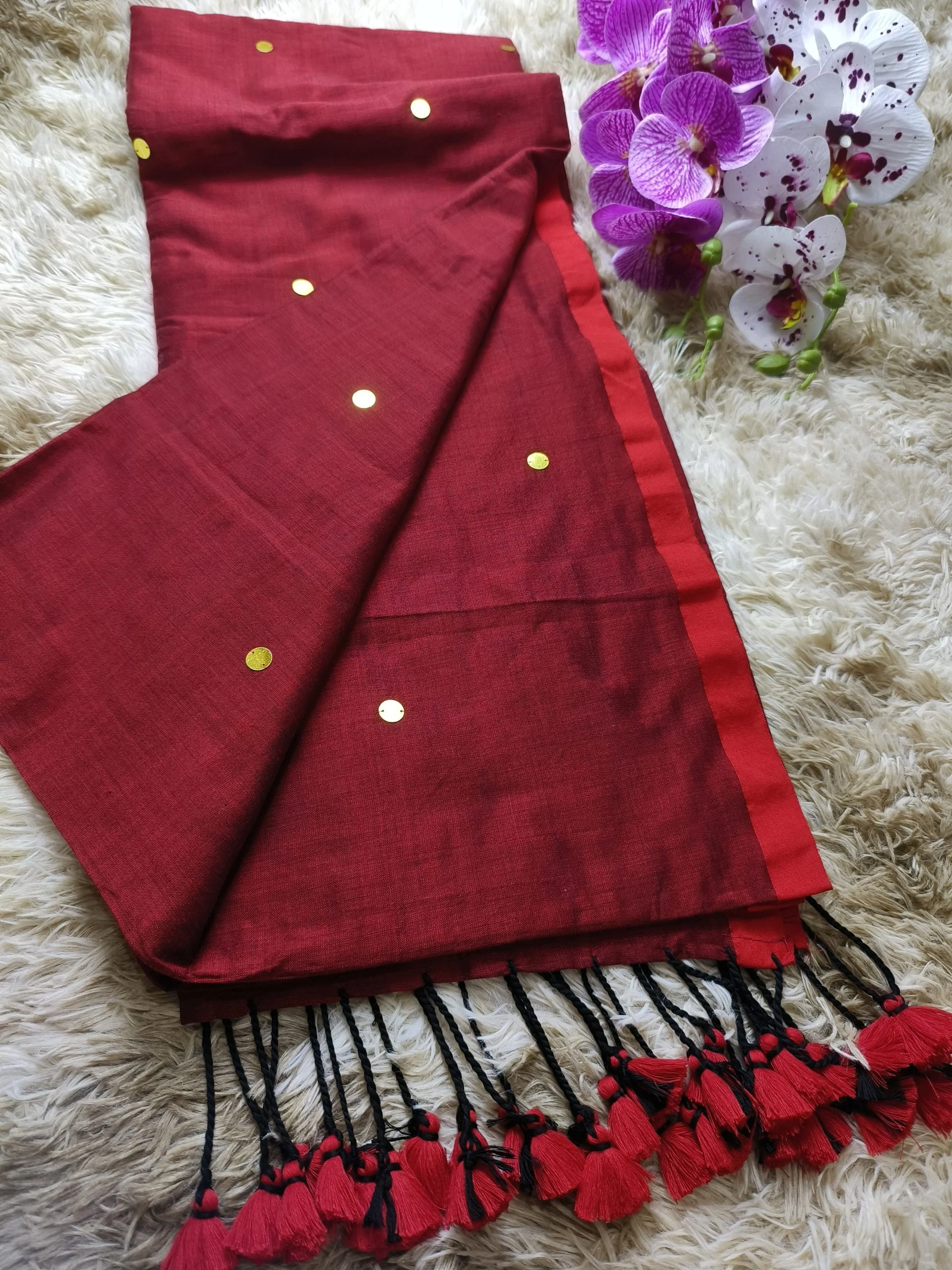 Presenting the trendy Chumki Khadi Cotton Saree collection. These sarees comes in reasonably soft and lightweight Khadi Cotton material. The whole saree is exquisitely handcrafted with chumki mirror works, which gives it a classy touch. The saree also has a thin contrast border, long pom-poms and comes with Running blouse.