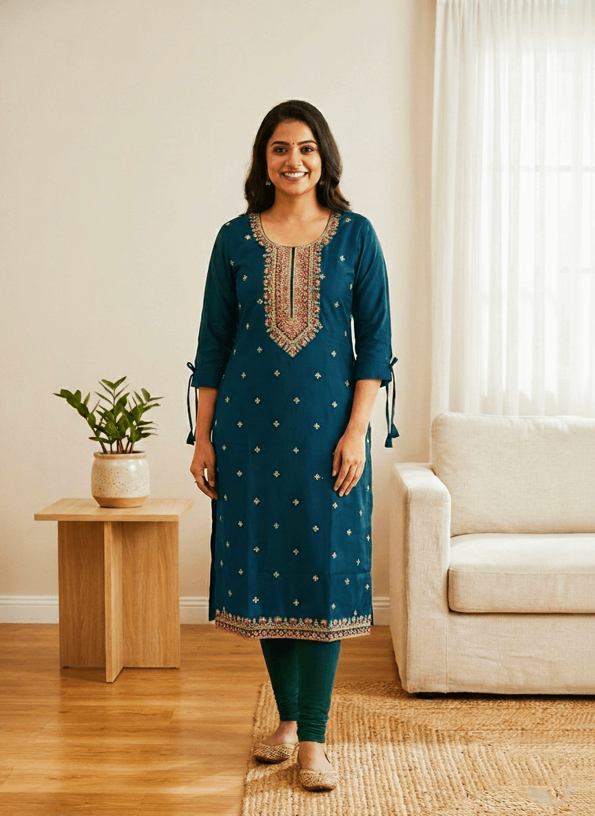 M – Chest 38”, Waist 35”, Kurti Length 28”