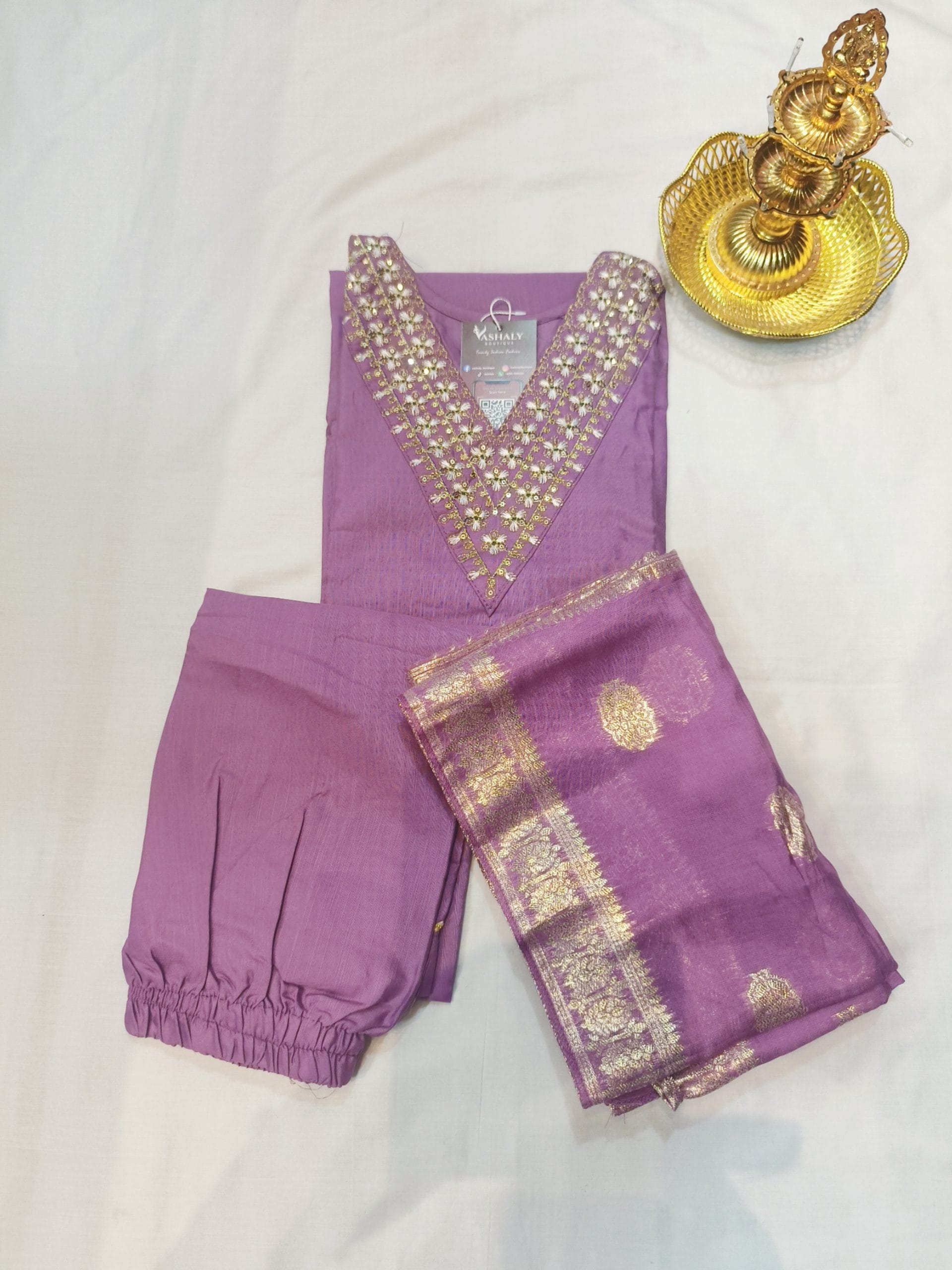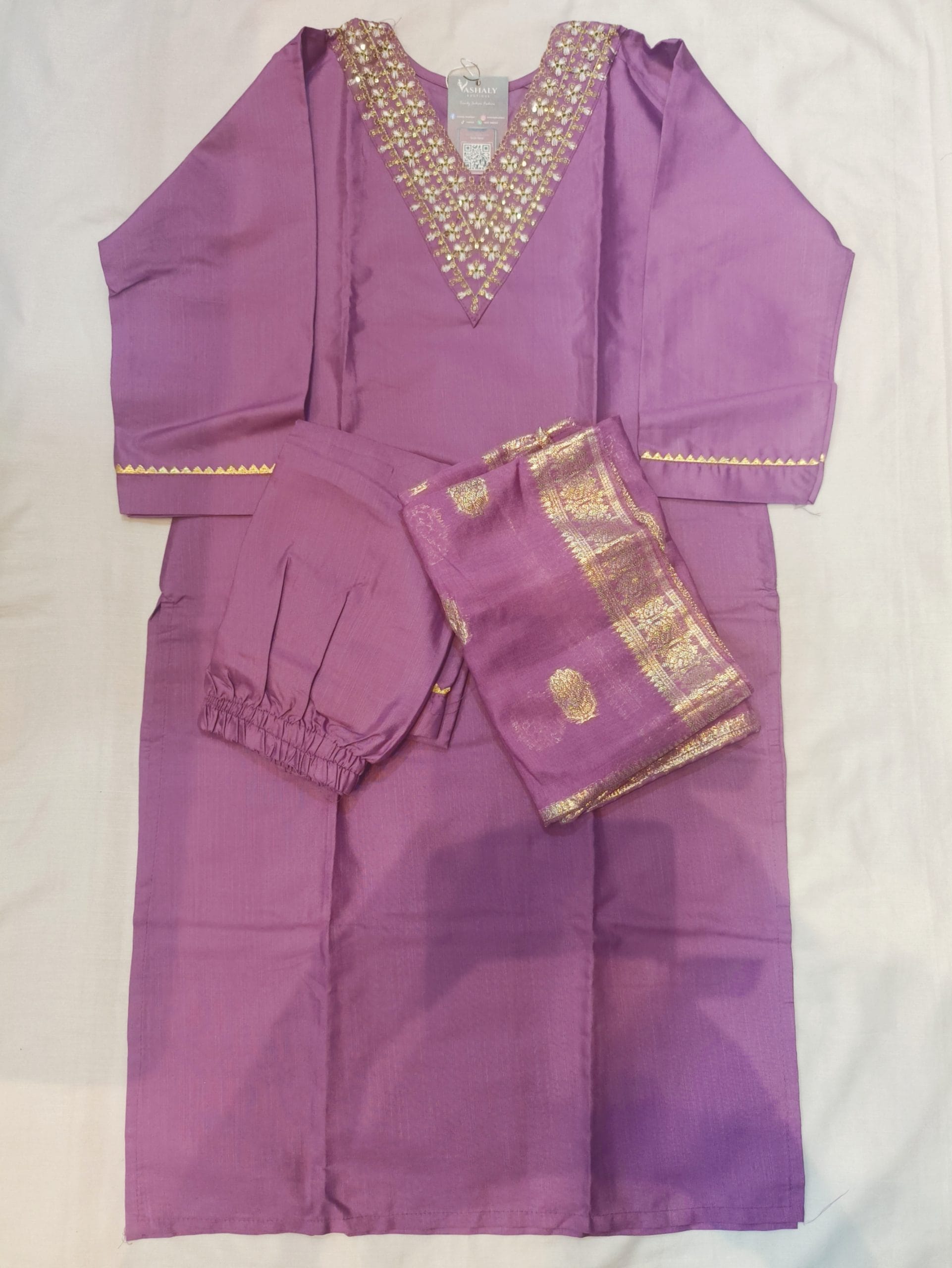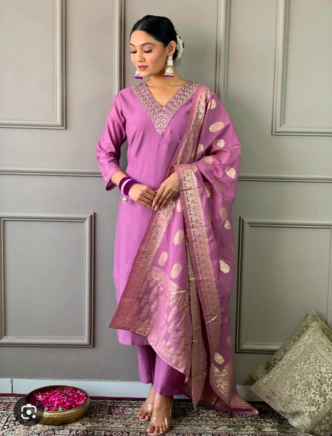 Presenting our latest festive of lights collection – the classy and elegant looking Diya 3 pc Suits. These festive look 3-piece sets comes in Silk-Cotton material with beautiful embroidety works around the chest and gold lining on sleeve-ends. The pants comes in plain cotton silk. Dupatta comes in a luxurious Banarasi Silk, adding a touch of traditional elegance ✨😍