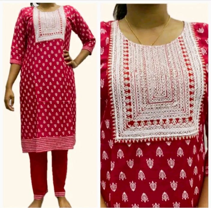 Kurtis Tops comes in Soft Cotton material with grand embroidery works on chest and printed motives all over. Pants comes in plain cotton with printed border. A very comfy yet a classical styled ethnic wear.