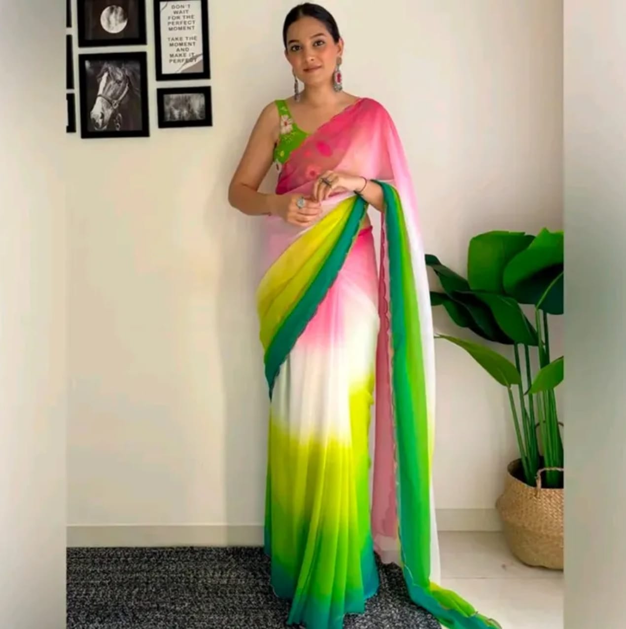 These sarees come in a very colourful ombre design which is soft, flowy and lightweight Chiffon material. It comes with decorative ruffled or frilled design as its border and a contrast blouse piece. Saree comes with a secured waistband with hooks and front pleats, which makes the saree so convenient to wear in just a minute !